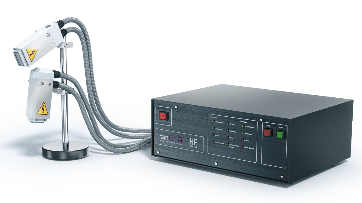 SpotTEC de TANTEC est utilisée pour augmenter la tension de surface des profilés, des câbles et des pièces plastiques injectées. La station de traitement de surface Corona